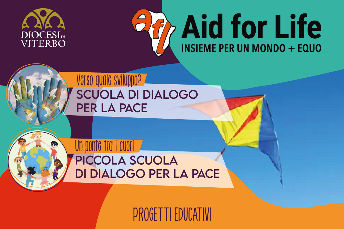 Il progetto Scuola di Dialogo per la Pace è promosso dall’équipe educativa di Aid for Life in collaborazione con l’Ufficio Pastorale Scolastico, il Centro Missionario Diocesano e la Diocesi di Viterbo. La campagna educativa articolata in più azioni, si rivolge ai giovani presenti sul territorio, in modo particolare alle Scuole Primarie, alle Scuole Secondarie di primo e secondo grado e alle parrocchie della Diocesi di Viterbo. Tuttavia, attraverso l’iniziativa dell’incontro con gli insegnanti, della mostra fotografica e del convegno finale, anche gli adulti saranno coinvolti e sensibilizzati sulle stesse tematiche.