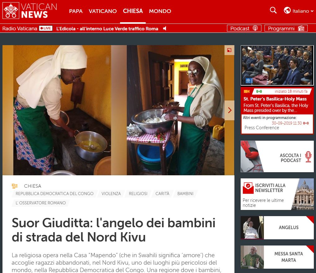 Sulla testata online Vatican News è apparso oggi un articolo molto dettagliato su Suor Giuditta, definita <<l’angelo dei bambini di strada del Nord Kivu>>.